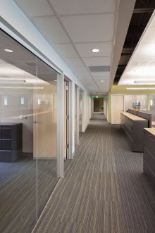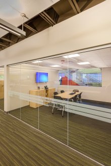 An interior décor which brings an uplifting spirit to the staff was desired. Colors and finishes with a bright, contemporary feel are used throughout. An emphasis is placed on vision and natural light, which is available to everyone in the building. The sky-lit atrium and a number of new windows provide abundant natural light and views. Glazed office and conference room walls share light from the exterior windows where the open office areas are located.